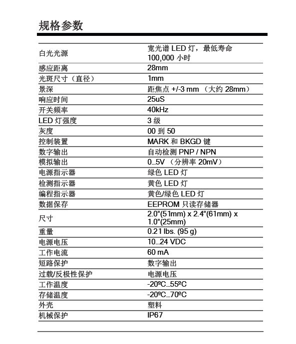 已調(diào)白光光源可聚焦為 2.5-3mm 光斑并直射目標(biāo)。返回到傳感器的漫射光會(huì)經(jīng)過測量。當(dāng)其級(jí)別等于或超過閾值時(shí),數(shù)字輸出將改變狀態(tài)。由于傳感器能夠快速響應(yīng),因此它適用于高速應(yīng)用場合。傳感器提供數(shù)字輸出,可自動(dòng)配置NPN 和 PNP。PLC 或計(jì)算機(jī)可用于監(jiān)控?cái)?shù)字輸出信號(hào)的狀態(tài)。